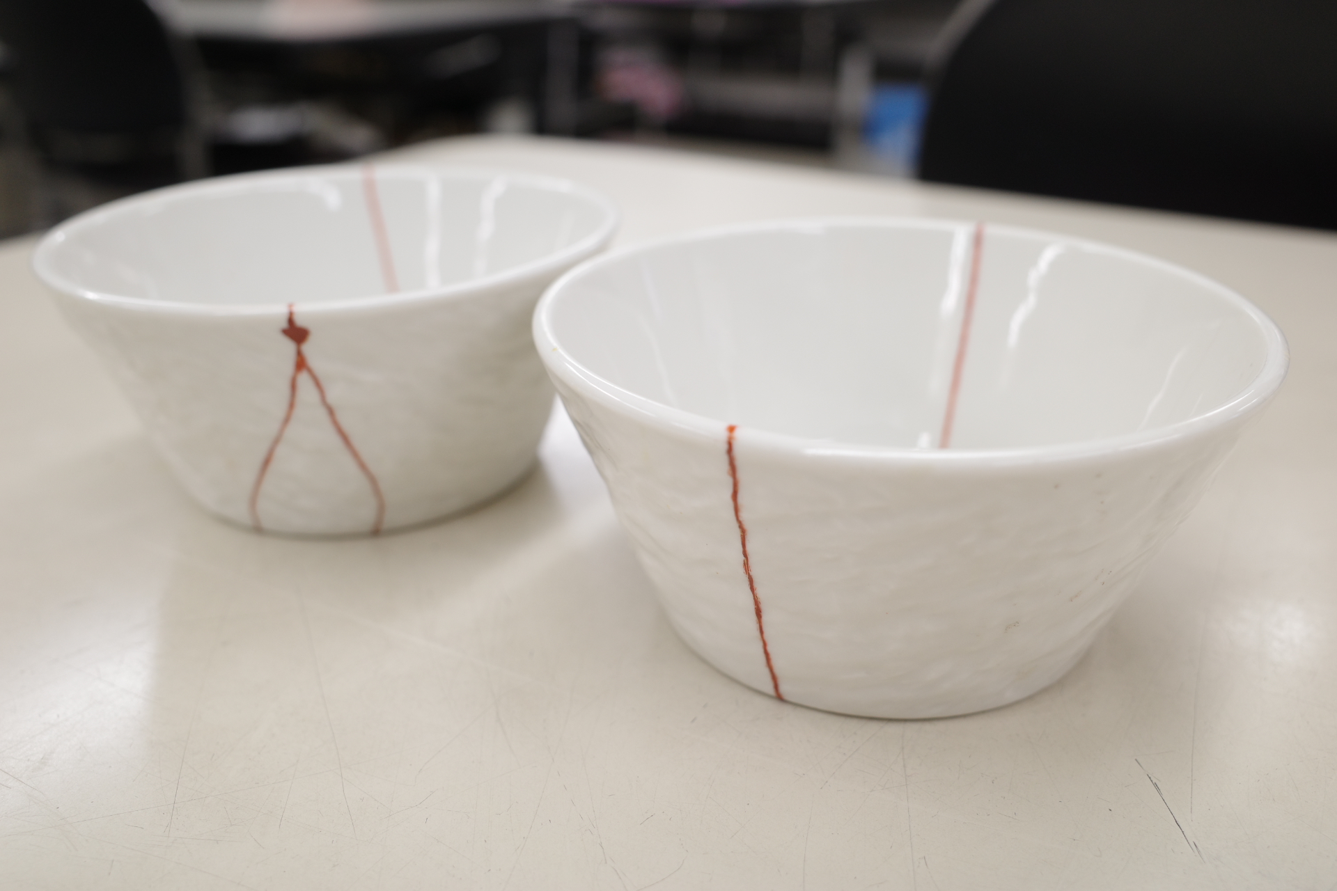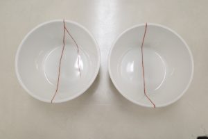 2つの同じ形の小鉢は相似形のように同じように割れていました。